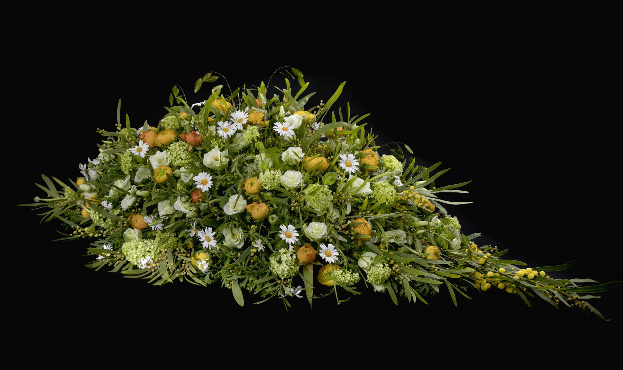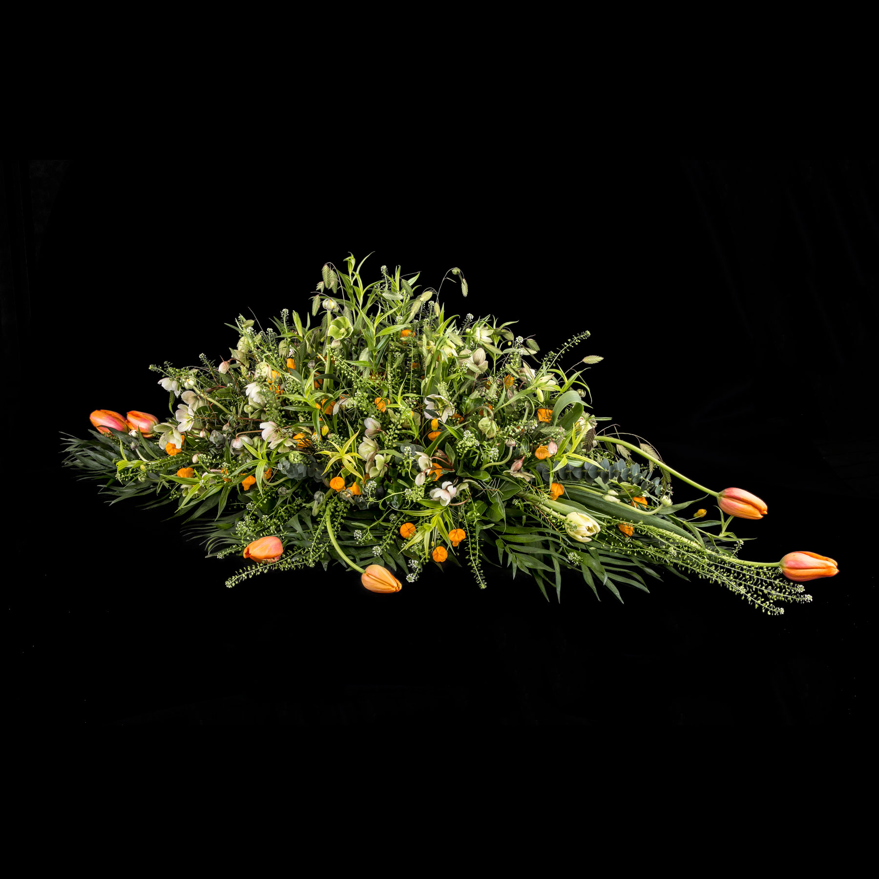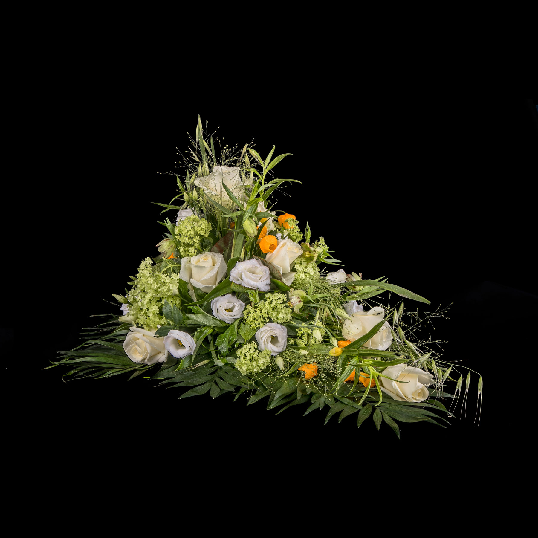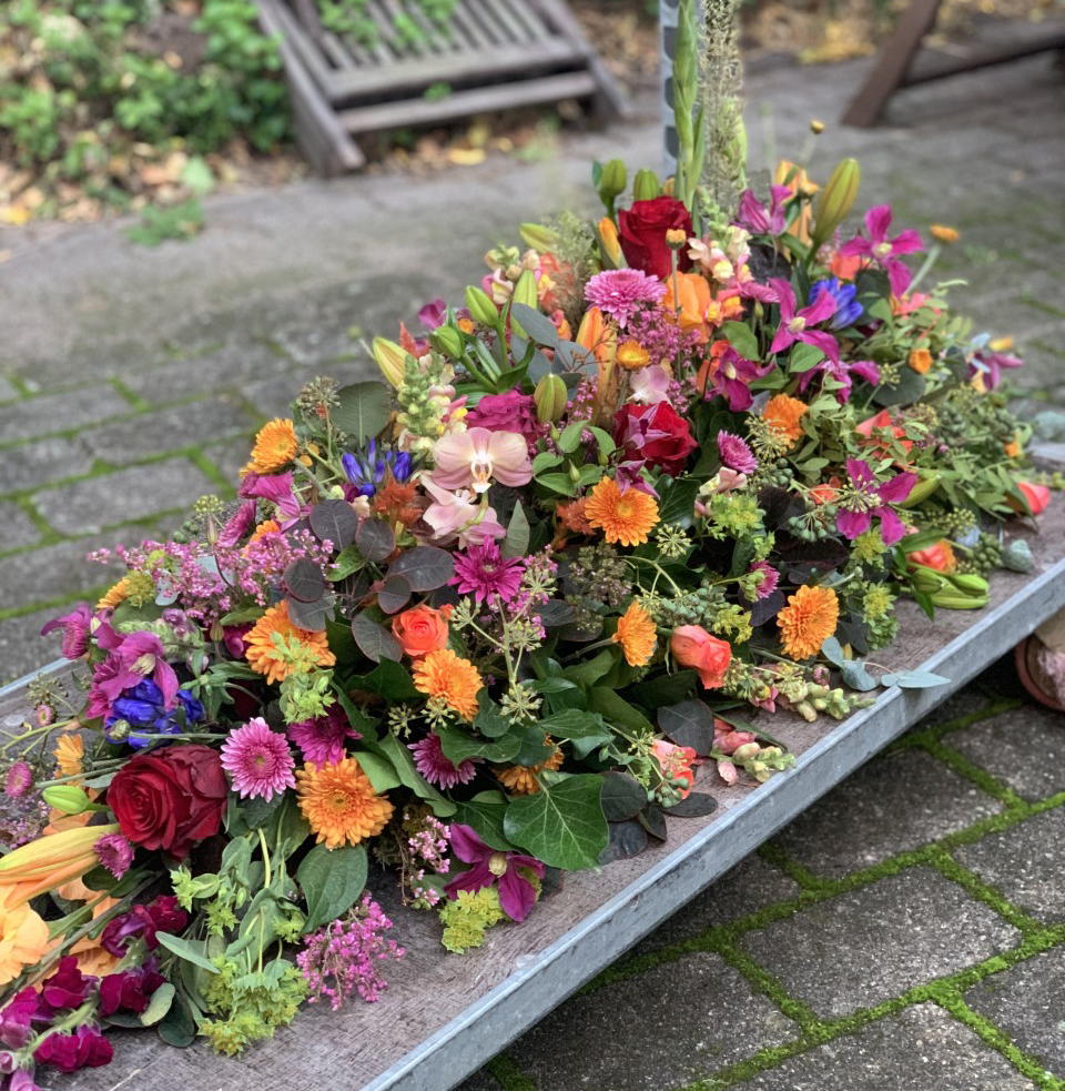 En smuk afskedshilsen er båredekorationen, der i form minder om en tåre, og hvor blomsterstilkene er isat oasis.
