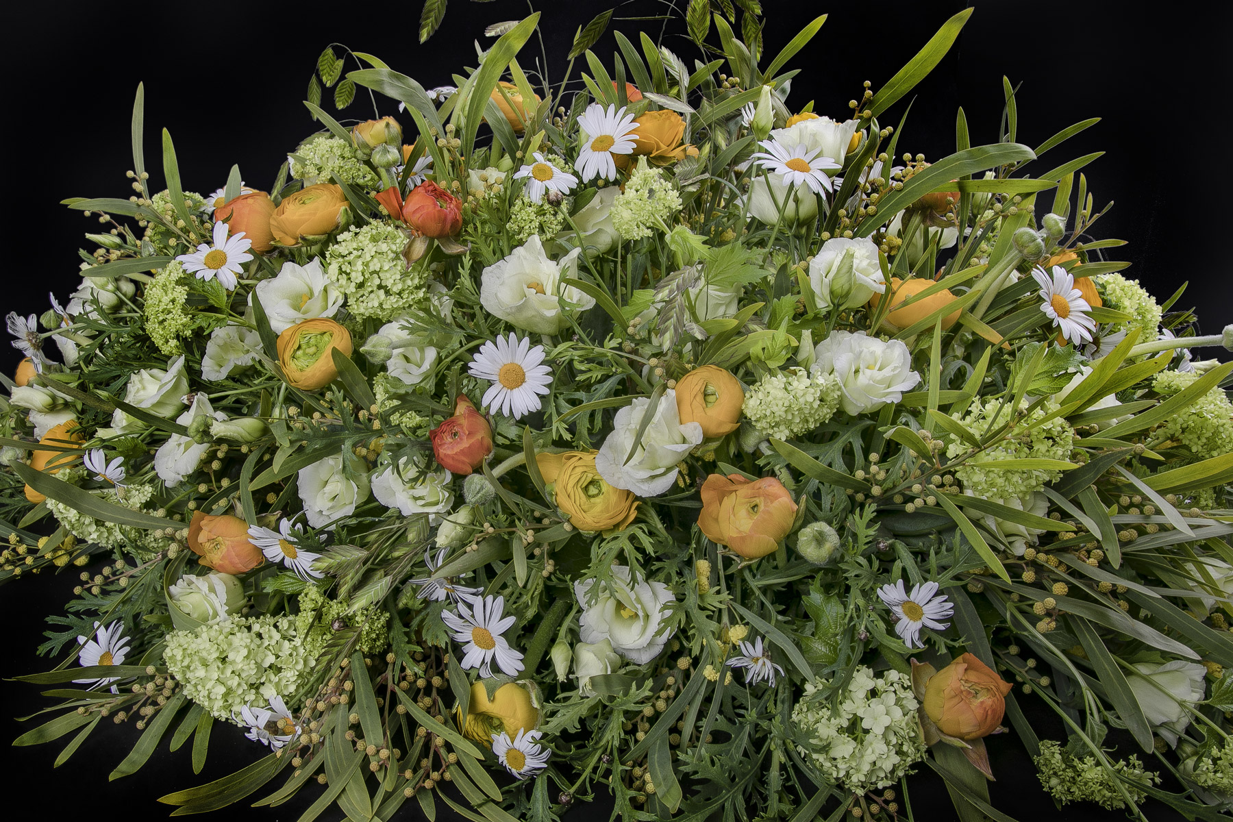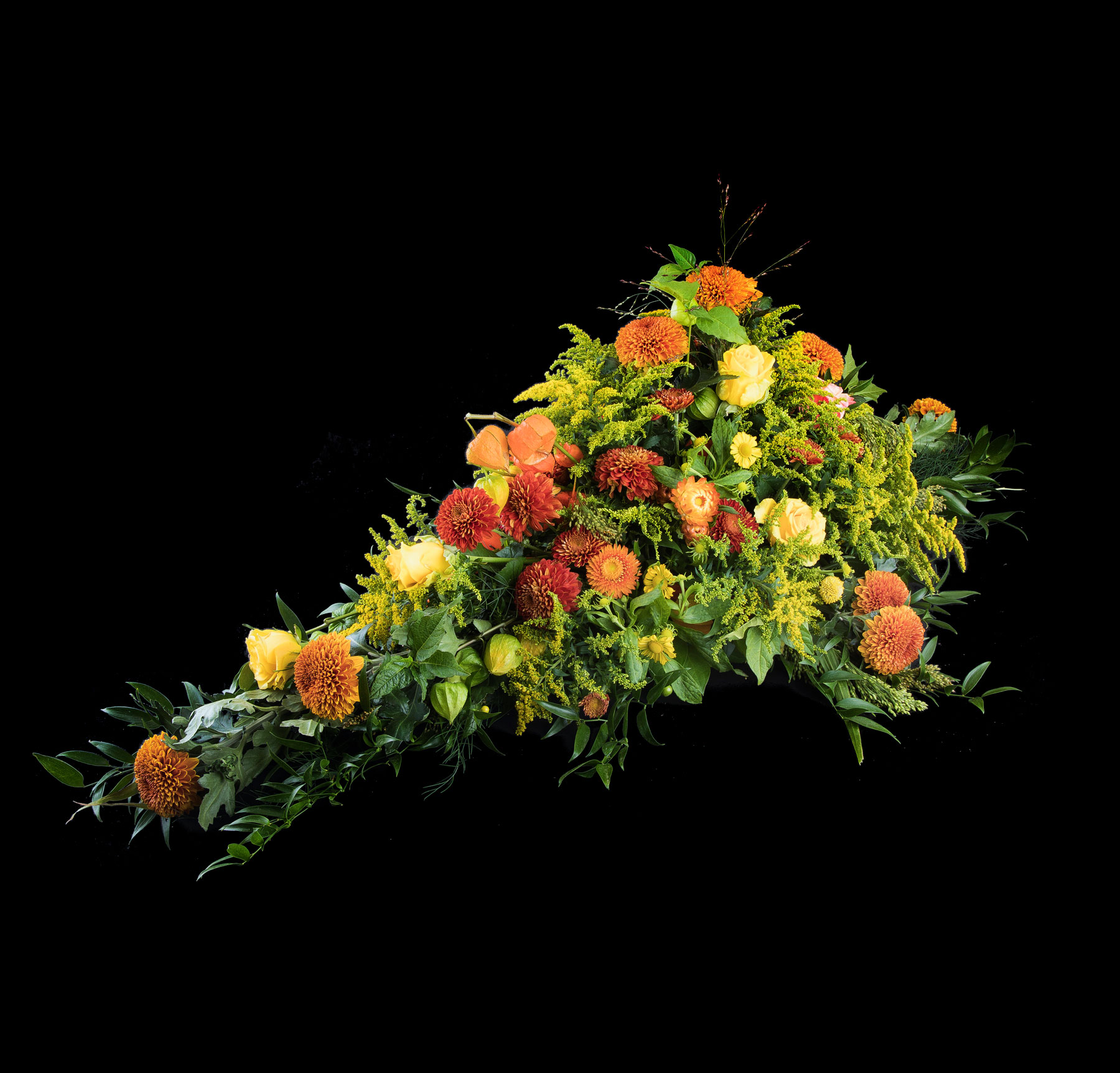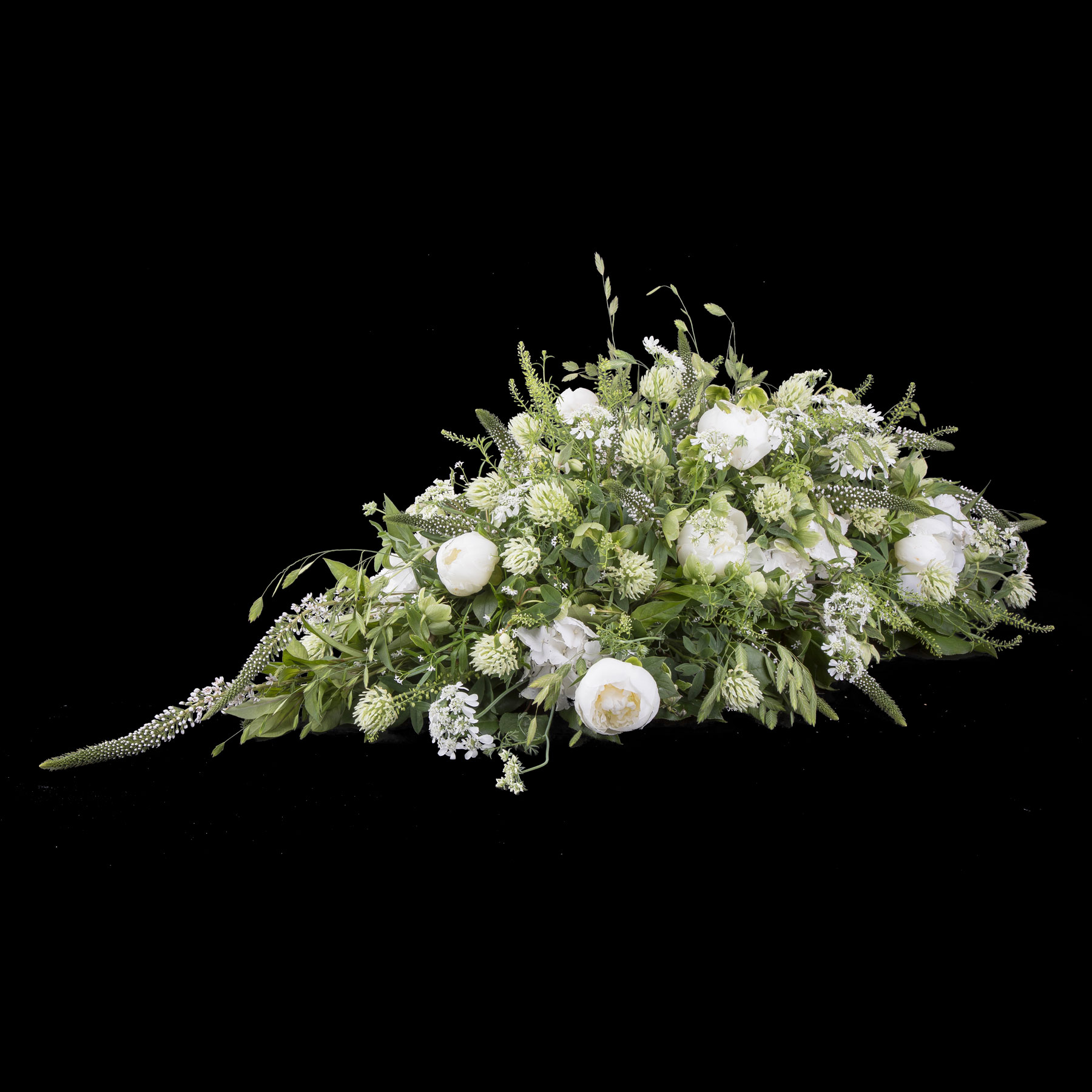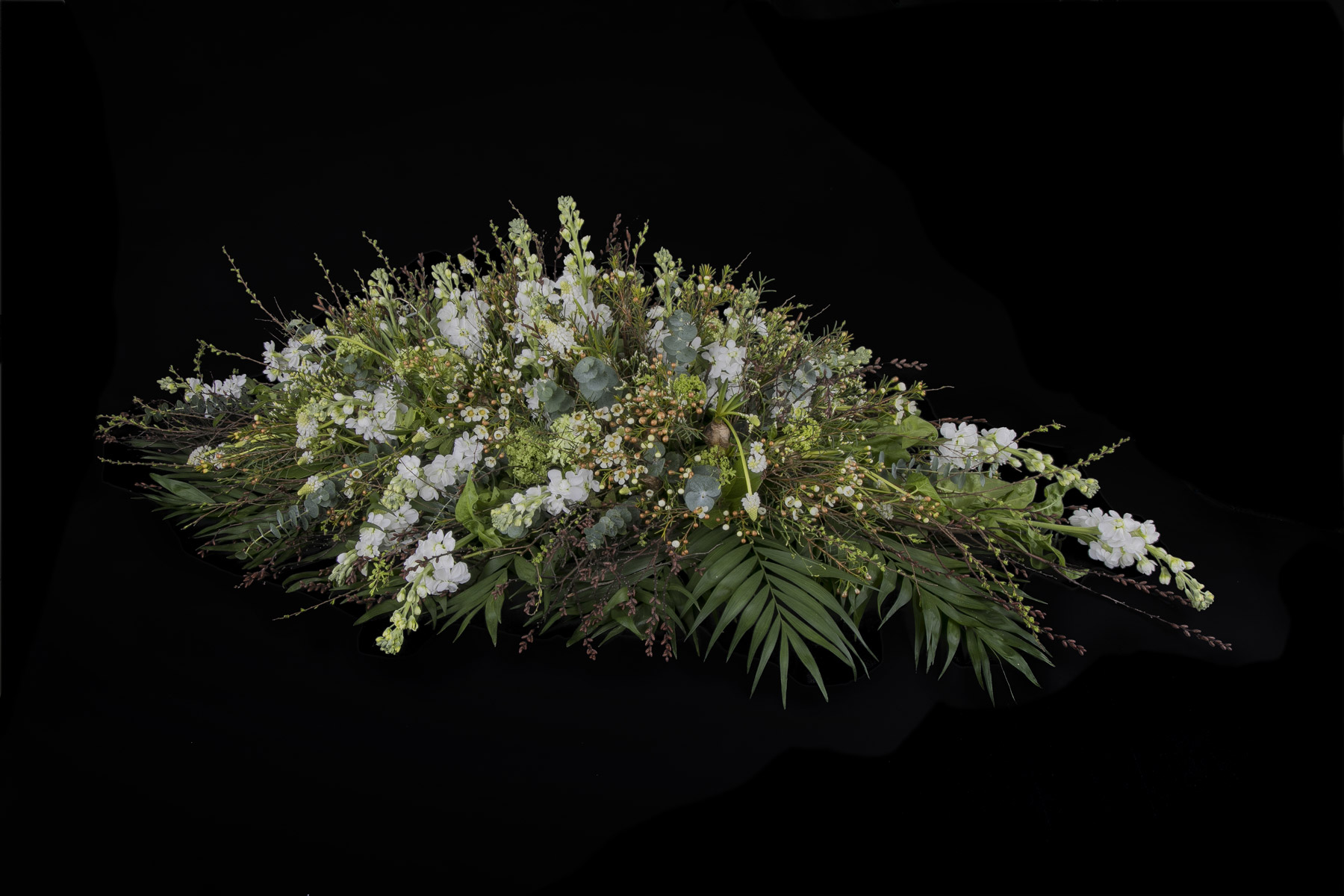En smuk afskedshilsen er båredekorationen, der i form minder om en tåre, og hvor blomsterstilkene er isat oasis.