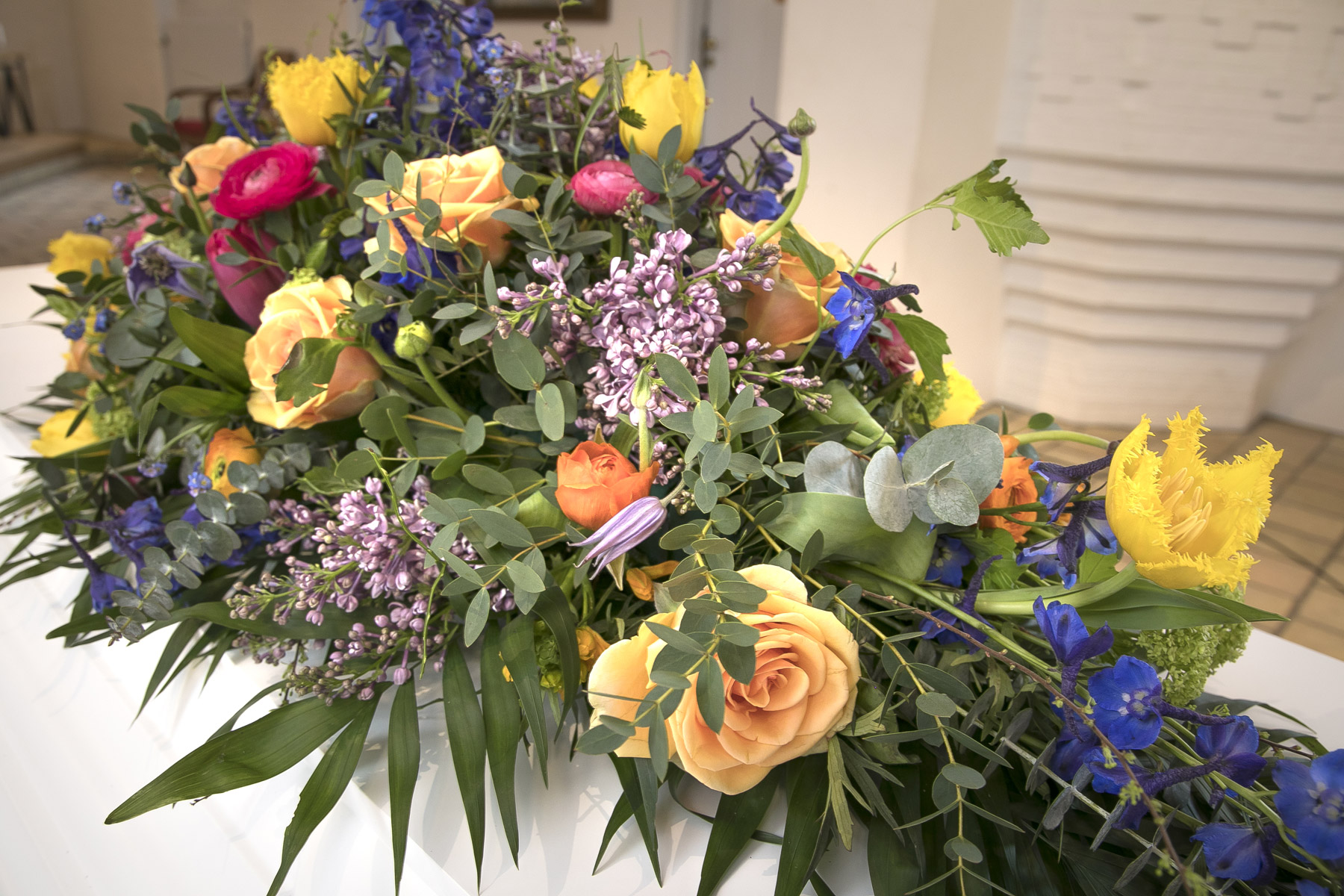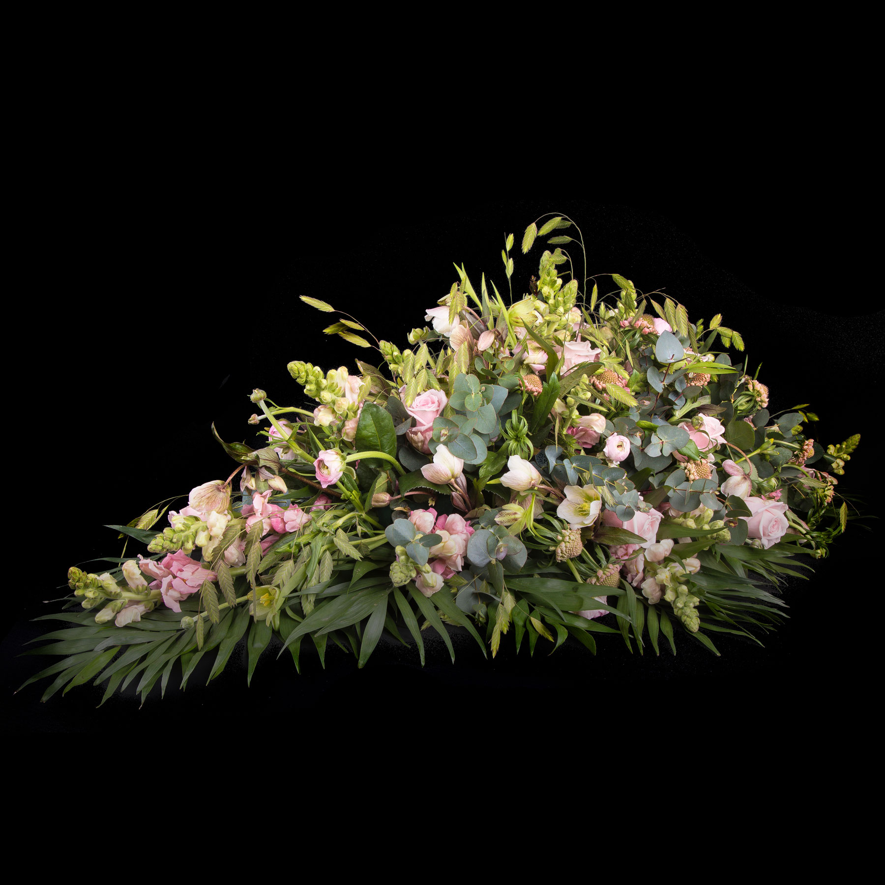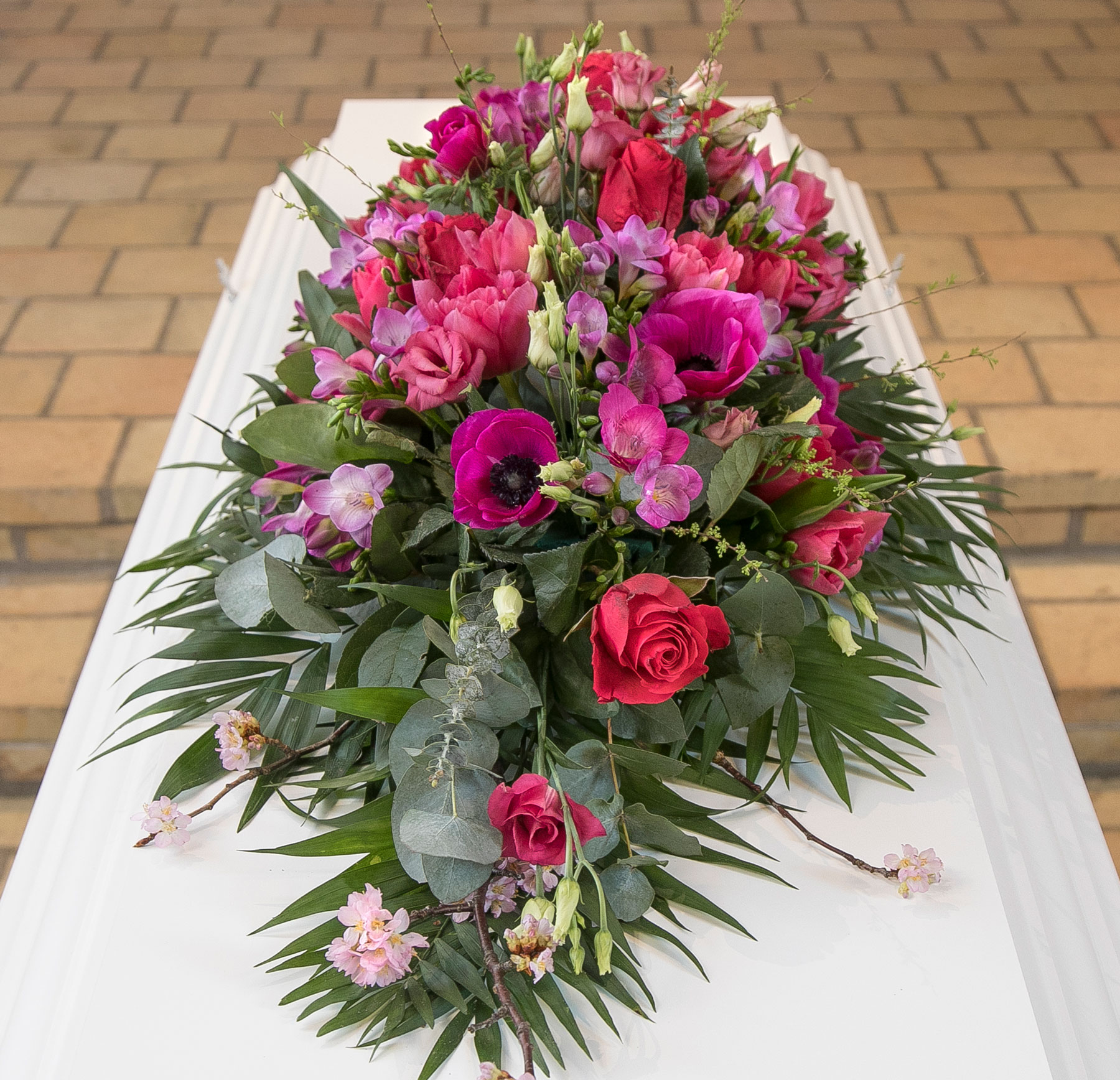 Erantis benytter sæsonens smukke blomstersnit. Det betyder, at dekoratøren binder ud fra billedets stemning, form og størrelse. Der vil derfor helt naturligt forekomme andre alternativer til det viste blomstersnit, dette alene for at sikre et unikt binderi til den sidste afsked.
