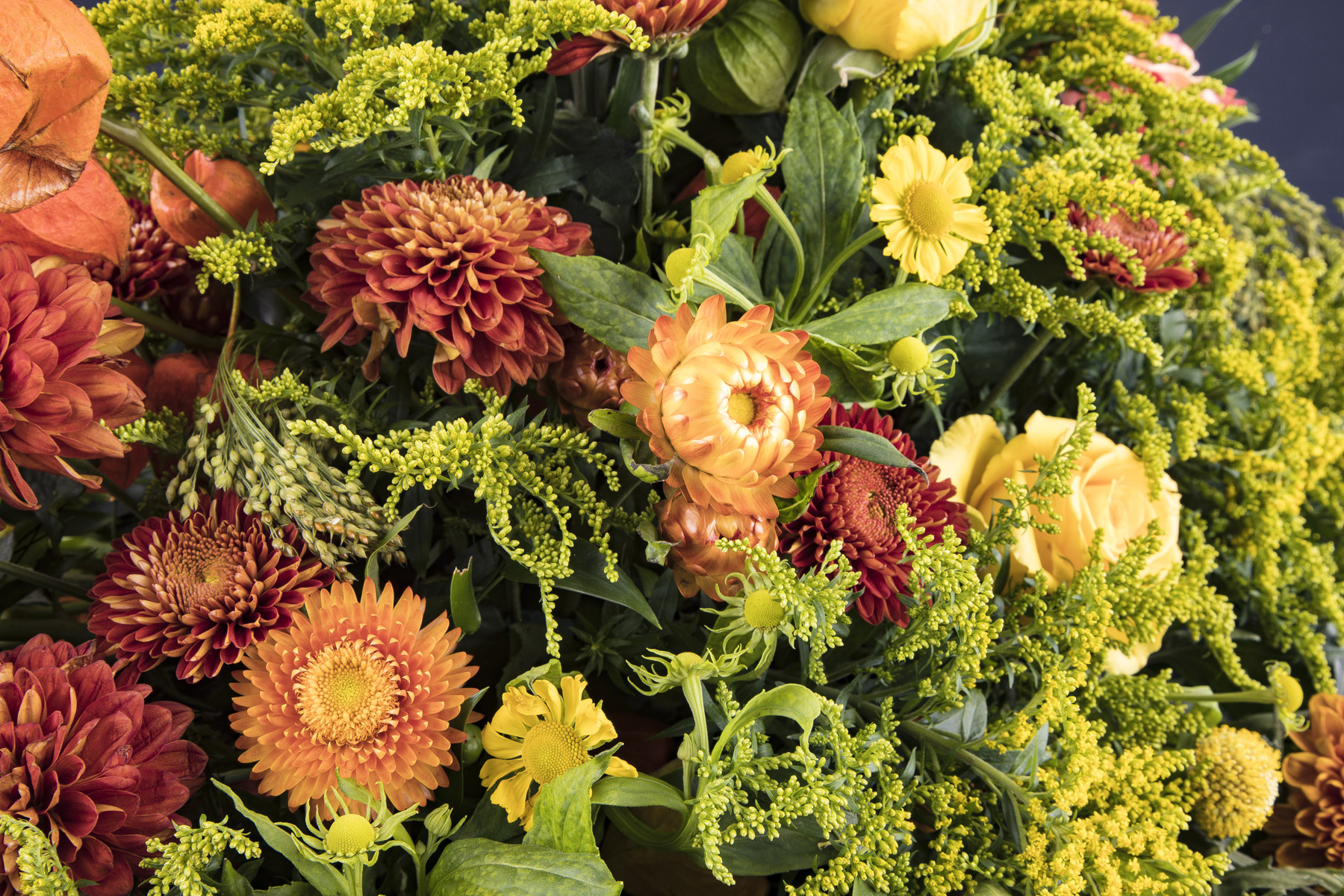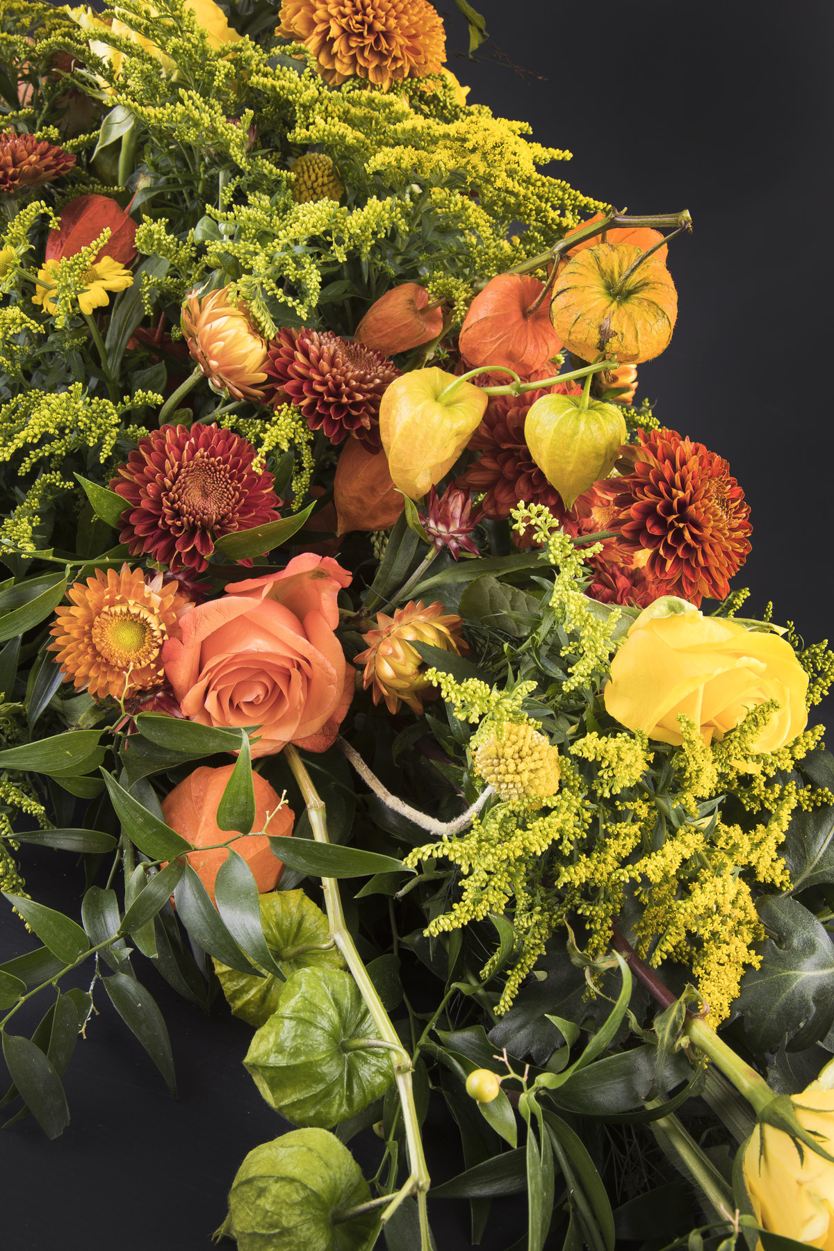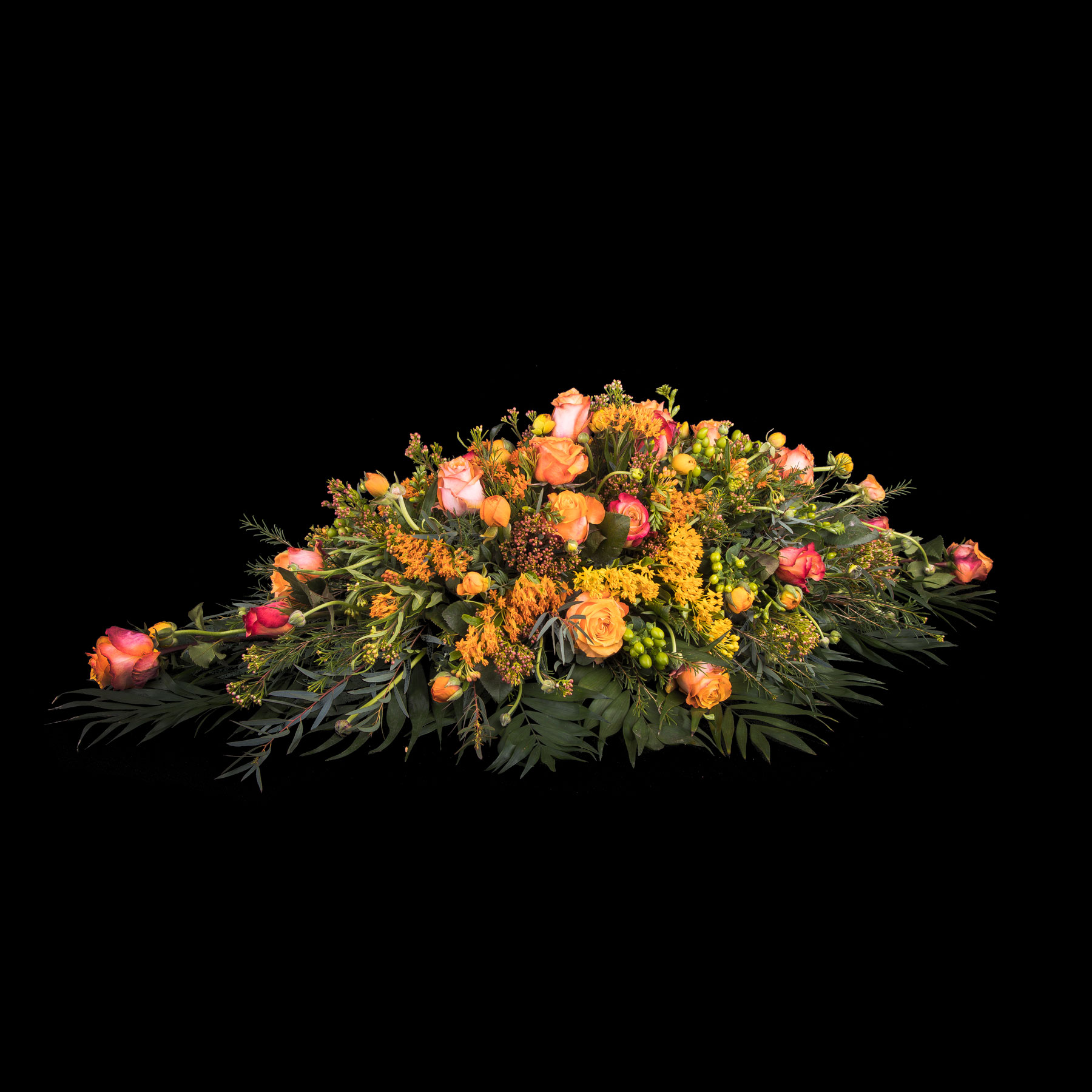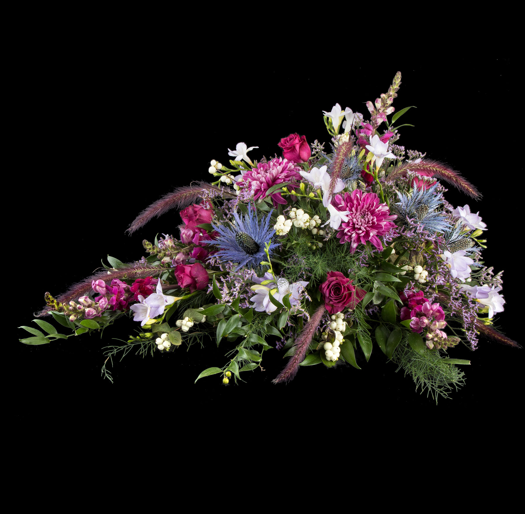 Erantis benytter sæsonens smukke blomstersnit. Det betyder, at dekoratøren binder ud fra billedets stemning, form og størrelse. Der vil derfor helt naturligt forekomme andre alternativer til det viste blomstersnit, dette alene for at sikre et unikt binderi til den sidste afsked.