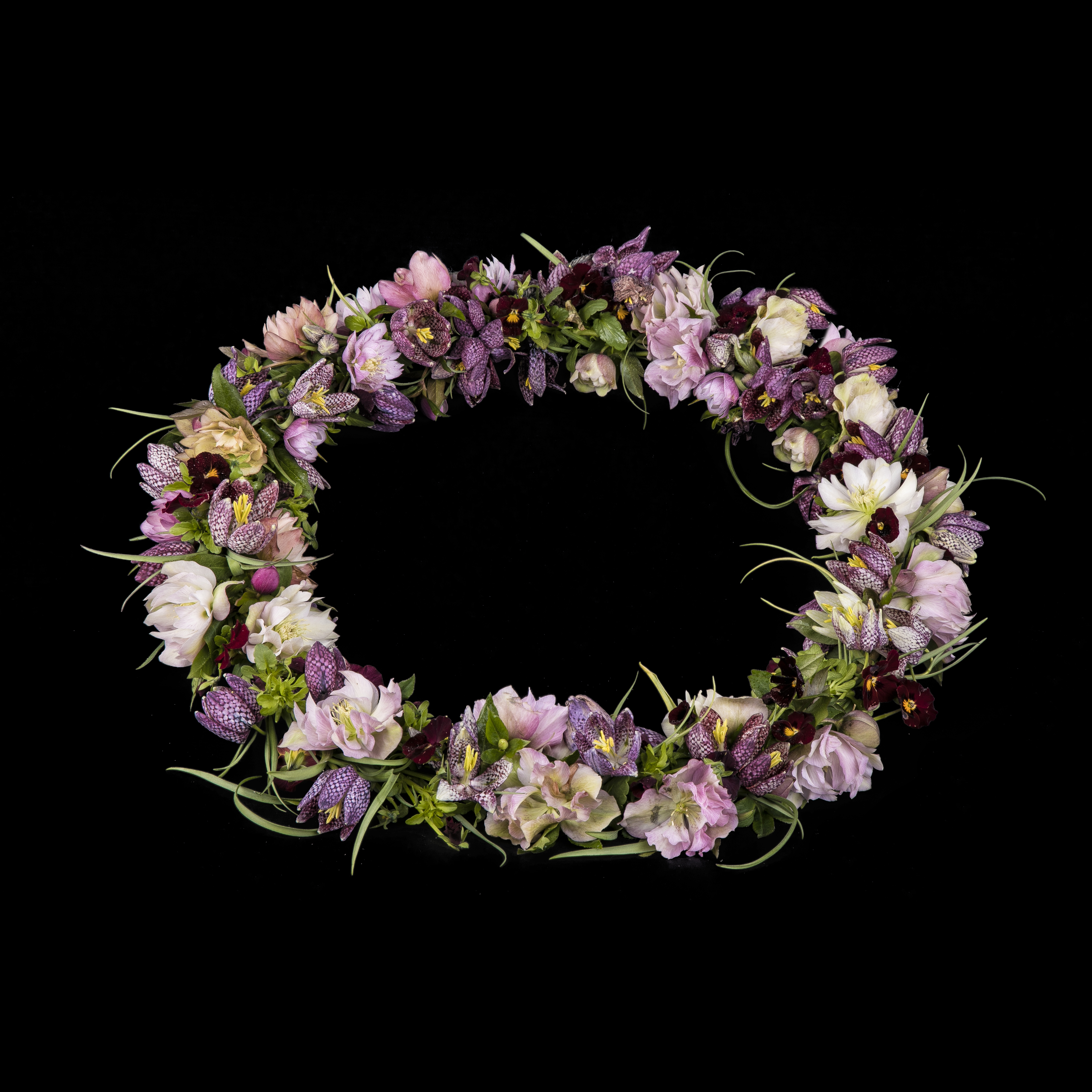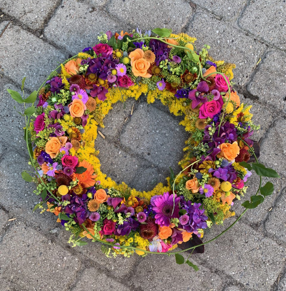 Smuk krans lavet ud fra dit farvevalg med årstidens blomster.