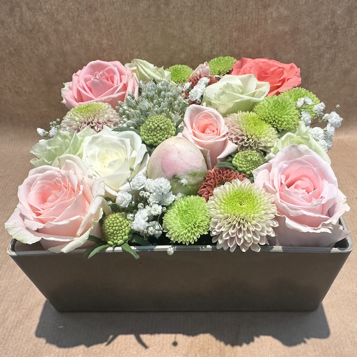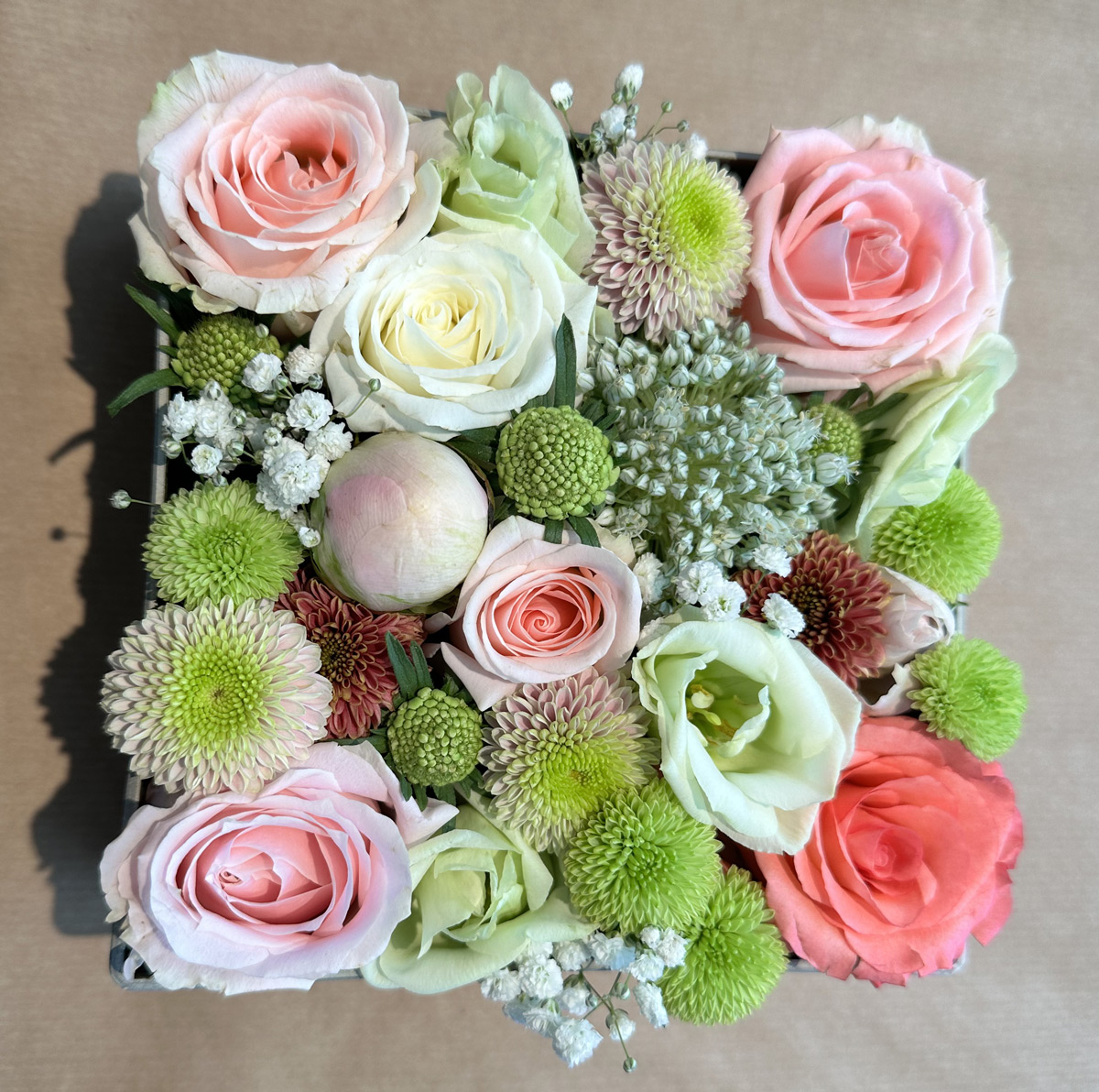 Blomsterdekorationen går til kanten af "kassen". Kassen er kvadratisk. Ofte en blomsterdekoration, der har lang holdbarhed, og i sensommer og efterår ofte en dekoration, der kan tørre.