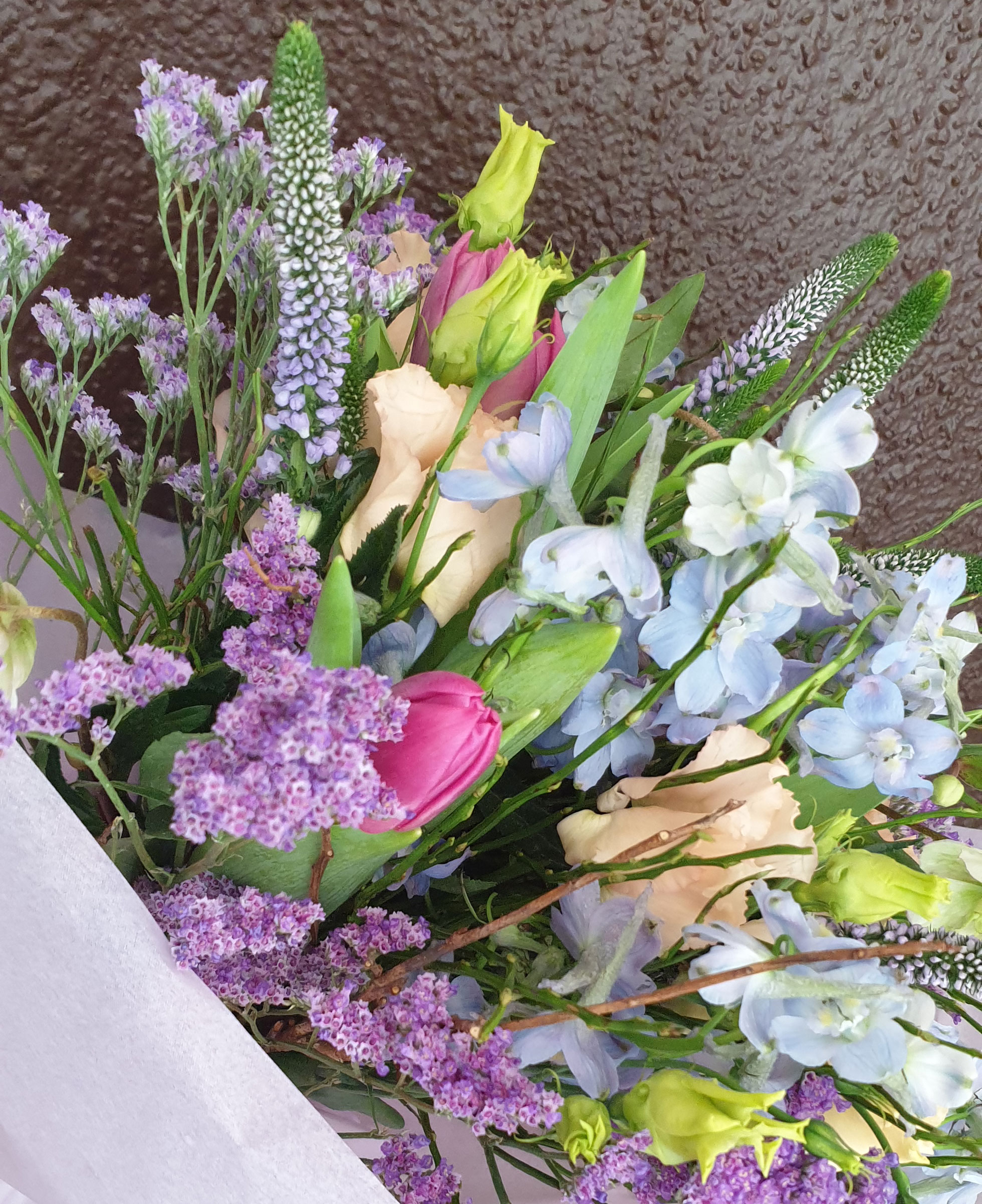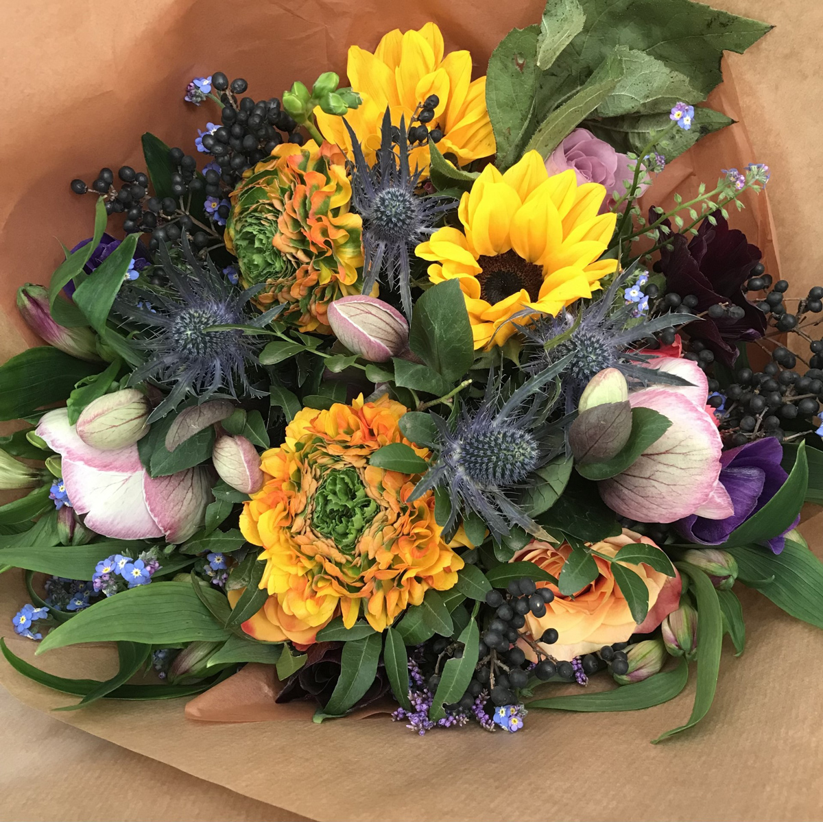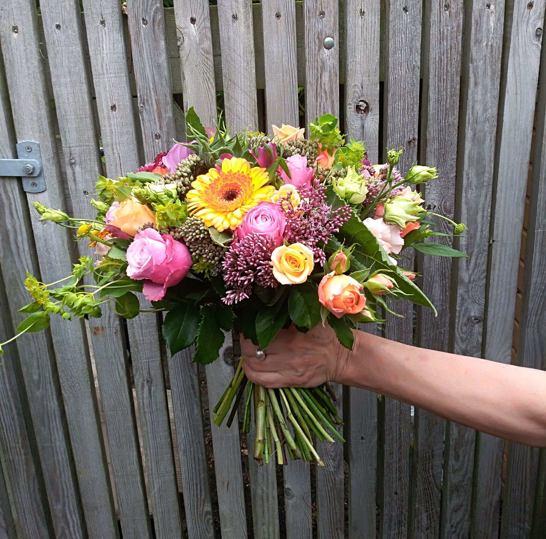 Den viste buket er floristens valg, og bindes altid ud fra det danske sortiment fra dagens indkøb på blomstertorvet, Copenhagen Market.