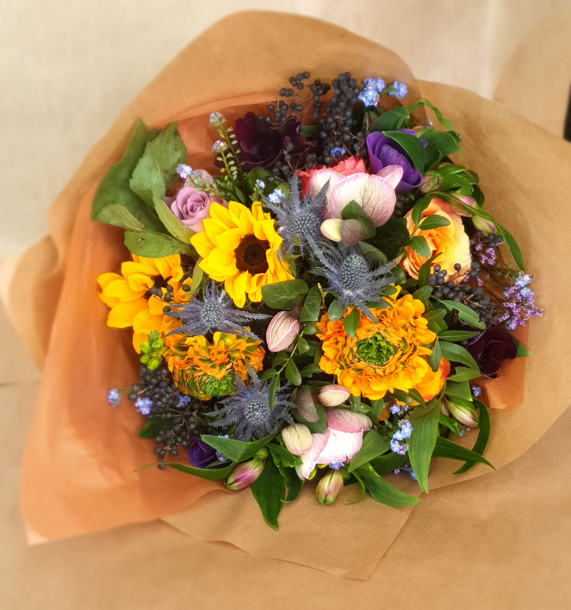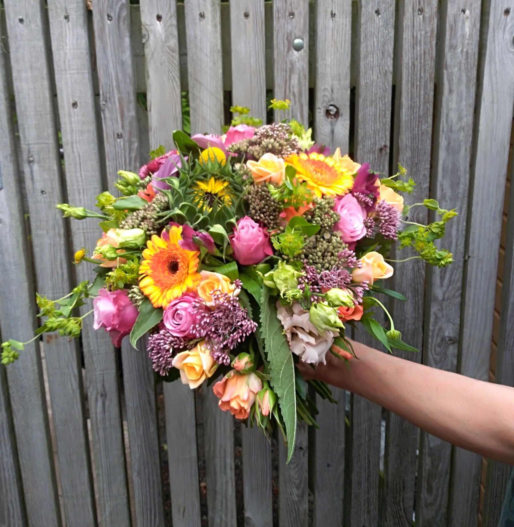 Buketter bundet i klare farvenuancer, som gul, lys orange, mørkegrønne og violette nuancer - buket med udtryk af varme, solen der ned over havet, sene aftentimer og ikke mindst dufte fra viol, roser, og latyrus